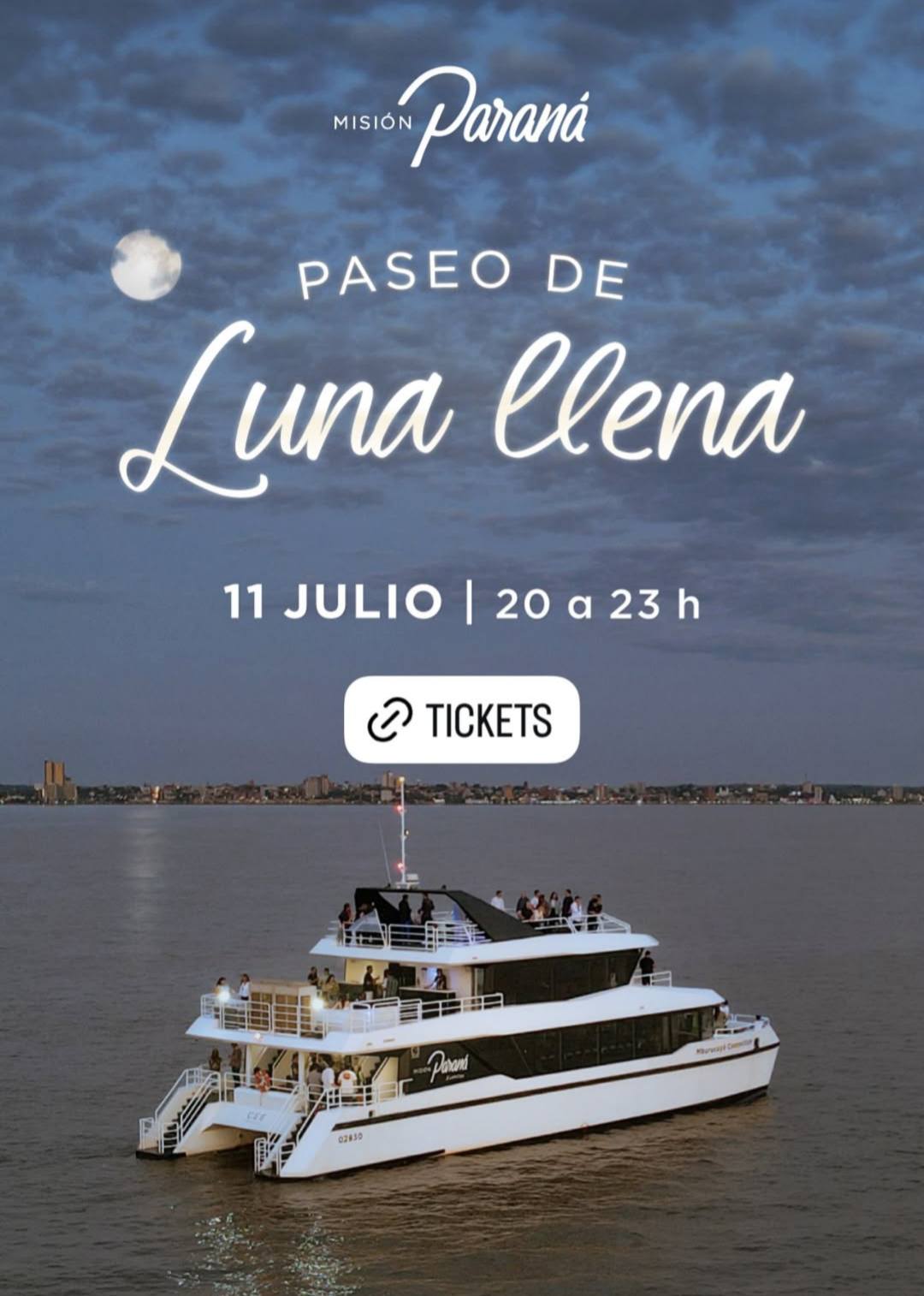 Paseo de Luna Llena en el Catamarán Misión Paraná. Embarque a las 20:00 horas. Compra de Ticket anticipada en www.misionparana.com/