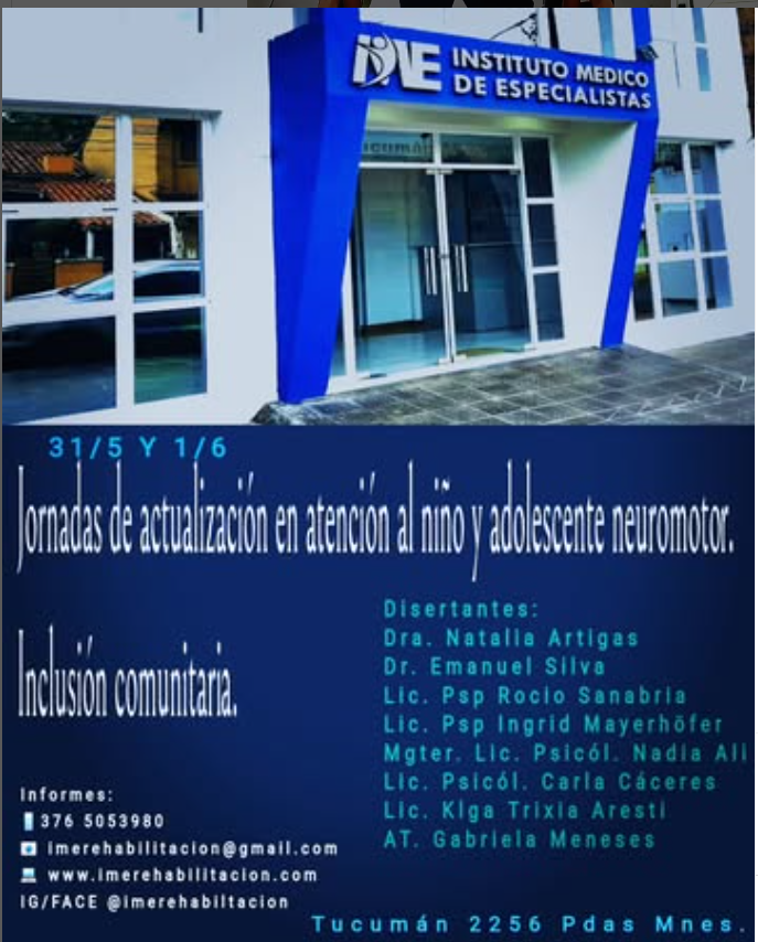 Destacado mayo 18 @ 8:00 am - 5:00 pm Jornadas de actualización en atención al niño y adolescente neuromotor IME (Instituto de Médicos Especialistas) Tucumán 2256, Posadas, Misiones, Argentina