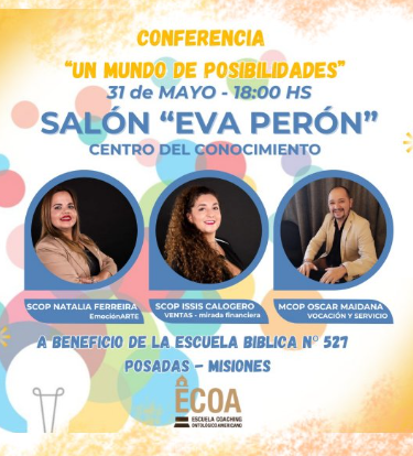 Destacado mayo 31 @ 8:00 am - 5:00 pm Conferencia «Un mundo de posibilidades» Centro de Convenciones - Parque del Conocimiento Ulises López y RN12 (Acceso Oeste), Posadas, Misiones, Argentina